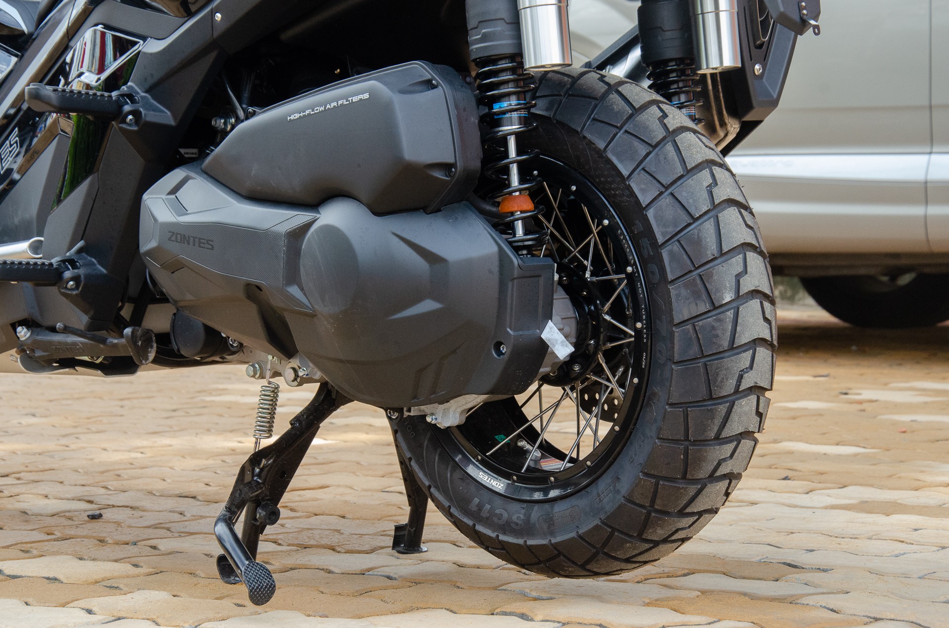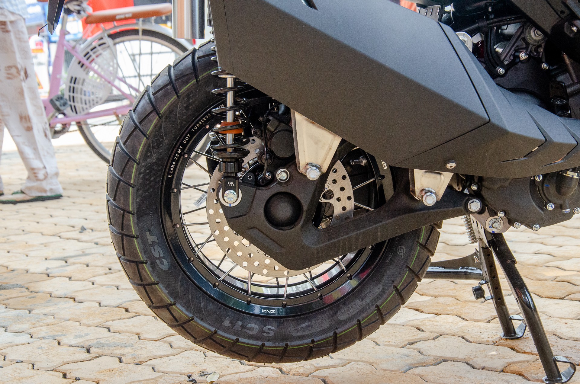 Hệ thống treo gồm phuộc ống lồng phía trước và phuộc đôi bình dầu phụ phía sau, đều có thể điều chỉnh. Bộ vành trước 17 inch kết hợp lốp 110/70, phía sau 14 inch với lốp 150/70, cả hai bánh đều trang bị phanh đĩa ABS. Cấu hình này cho thấy xe hướng đến sự cân bằng giữa đi phố, đi tour và cả off-road nhẹ.