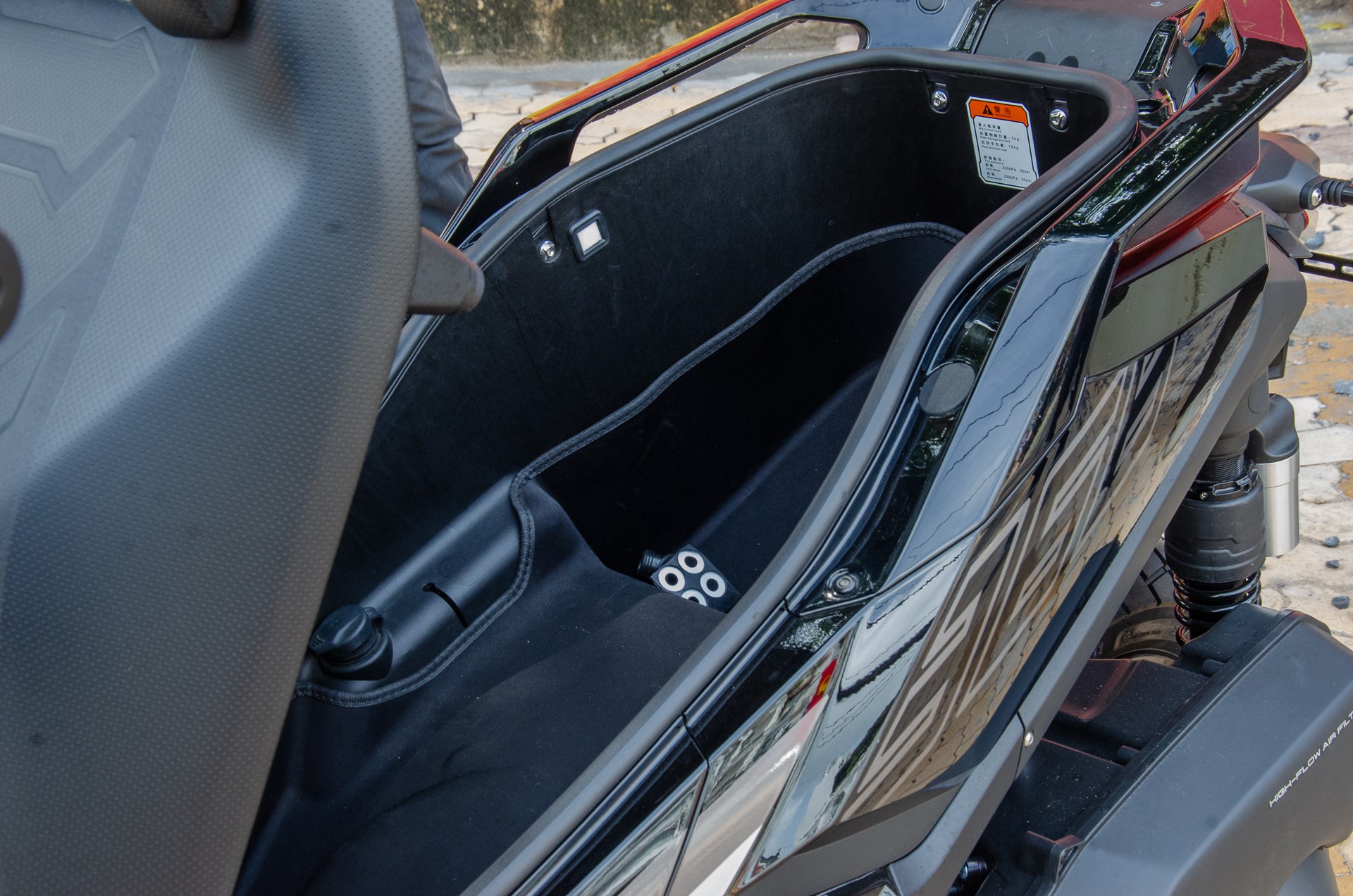 Yên xe dạng phân tầng với chiều cao 770 mm phù hợp với vóc dáng số đông. Cốp dưới yên đủ sức chứa hai mũ bảo hiểm full-face, có đèn chiếu sáng và cơ cấu thủy lực hỗ trợ đóng mở – chi tiết thường chỉ xuất hiện trên xe ga cao cấp châu Âu. Bình xăng dung tích lớn 17,5 lít giúp tăng khả năng di chuyển đường dài.