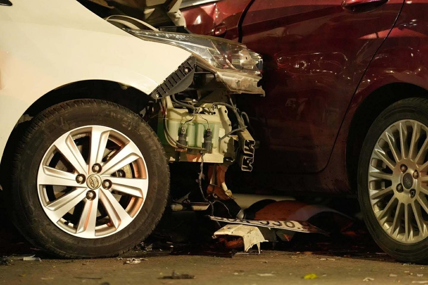 Tại hiện trường, nhiều ô tô và xe máy bị hư hỏng, các mảnh vỡ văng khắp mặt đường.