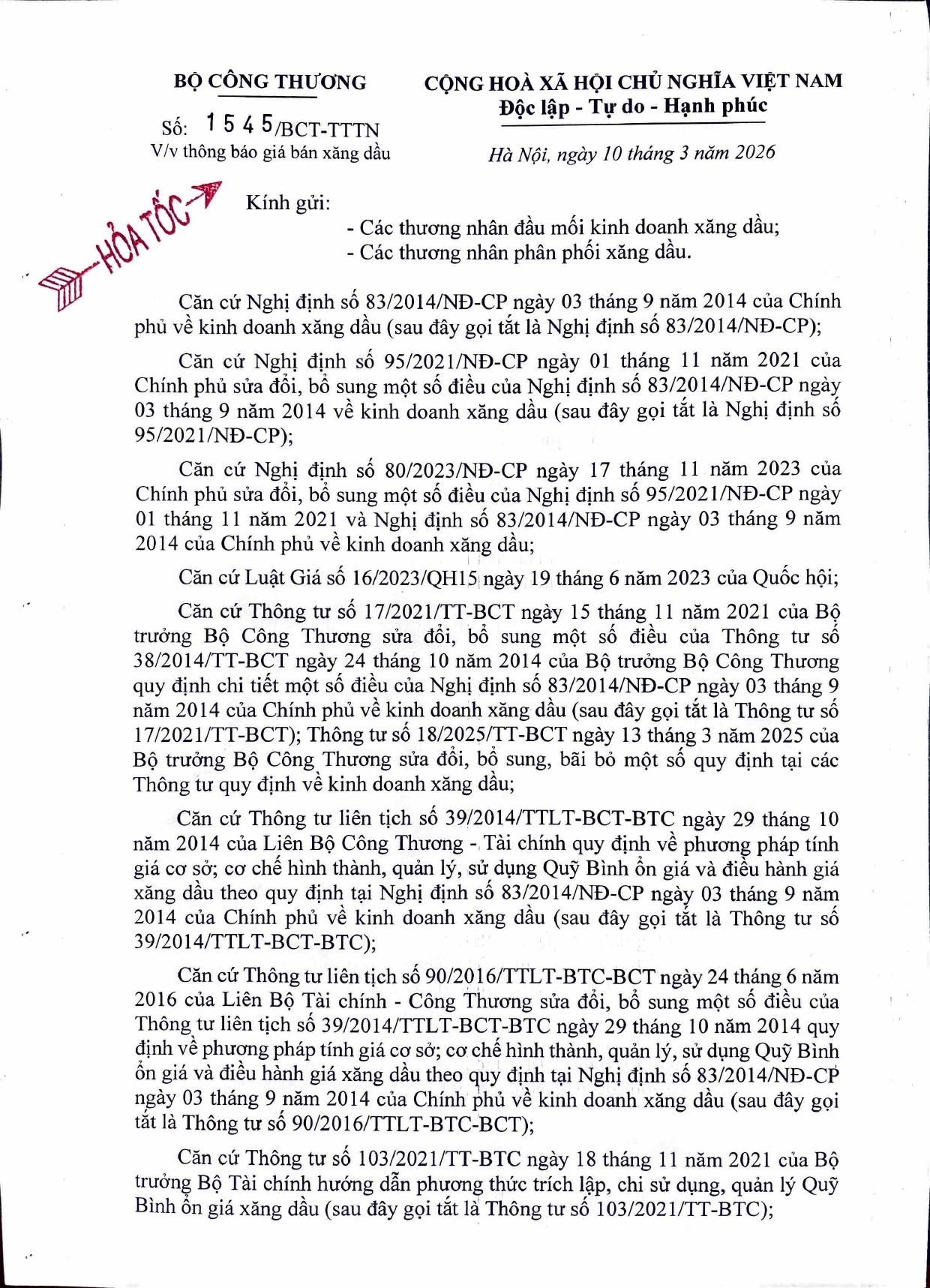 Bộ Công thương vừa ban hành văn bản hỏa tốc số 1582/BCT-TTTN ngày 11/3/2026 gửi các thương nhân đầu mối và phân phối xăng dầu về việc điều hành kinh doanh xăng dầu.
