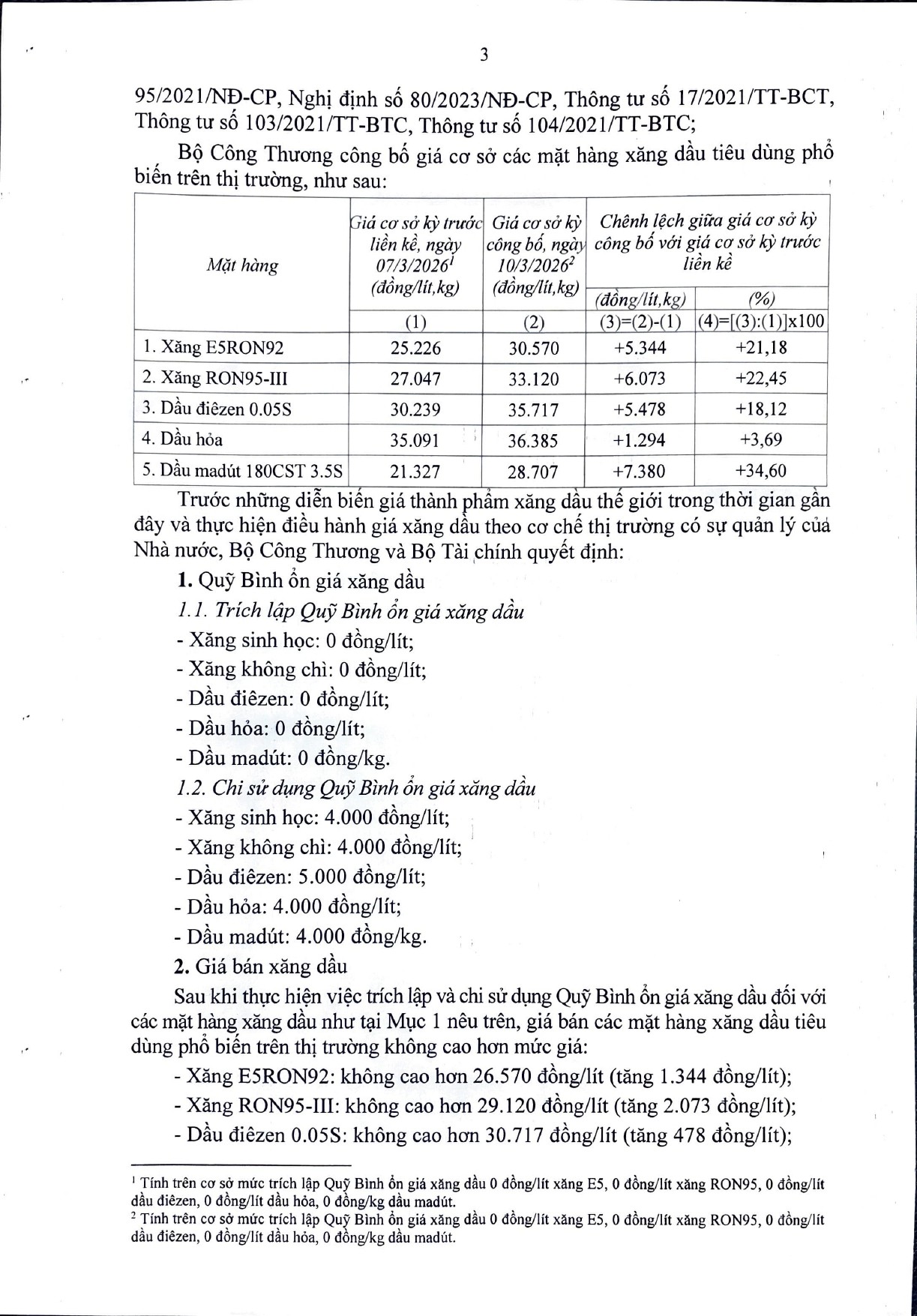 Thời điểm áp dụng mức giá cơ sở mới sẽ kéo dài đến trước kỳ công bố kế tiếp của Bộ Công Thương. Các doanh nghiệp thực hiện điều chỉnh giá theo đúng quy định tại các Nghị định và Thông tư hiện hành về quản lý kinh doanh xăng dầu và sử dụng Quỹ Bình ổn. Bộ Công Thương cho biết sẽ tiếp tục phối hợp với các cơ quan chức năng để kiểm tra, giám sát việc thực hiện quy định về bảo đảm nguồn cung xăng dầu, và xử lý nghiêm các hành vi vi phạm nếu phát hiện.