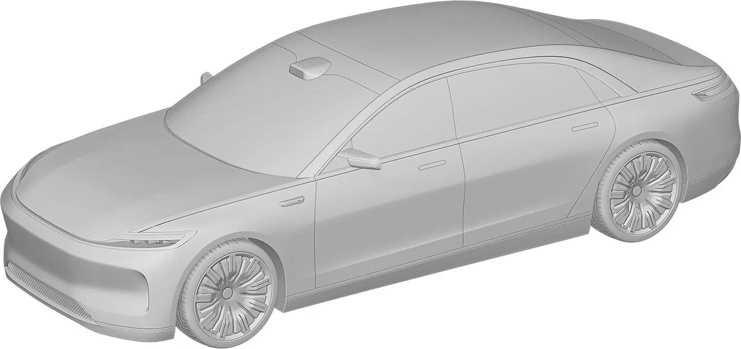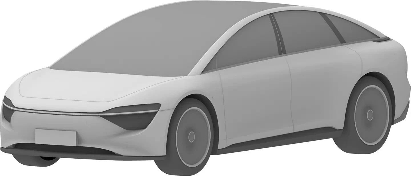 Bản vẽ đầu tiên mô tả một mẫu sedan dáng fastback, nhấn mạnh khí động học và phong cách trẻ trung. Ngôn ngữ thiết kế gợi liên tưởng đến Luxeed S7, mẫu sedan từng được giới thiệu trong hệ sinh thái HIMA. Phần đầu xe khép kín, dải đèn LED kéo dài toàn chiều ngang, cụm đèn pha chia tầng và các khe gió tạo hình sắc cạnh cho thấy định hướng tối ưu lực cản không khí và tích hợp công nghệ hỗ trợ lái.