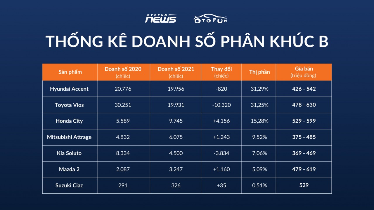 Xét về thị phần, Hyundai Accent chiếm 31,29% toàn phân khúc, còn Toyota Vios chiếm 31,25%. Tuy nhiên, khi so sánh với doanh số bán hàng năm 2020 có thể thấy một sự thay đổi lớn. Đáng chú ý, doanh số năm 2021 của Toyota Vios chỉ đạt 65% so với năm trước đó khi sụt giảm tới 10.320 xe. Hyundai Accent giảm nhẹ 820 xe, tương đương gần 4%.