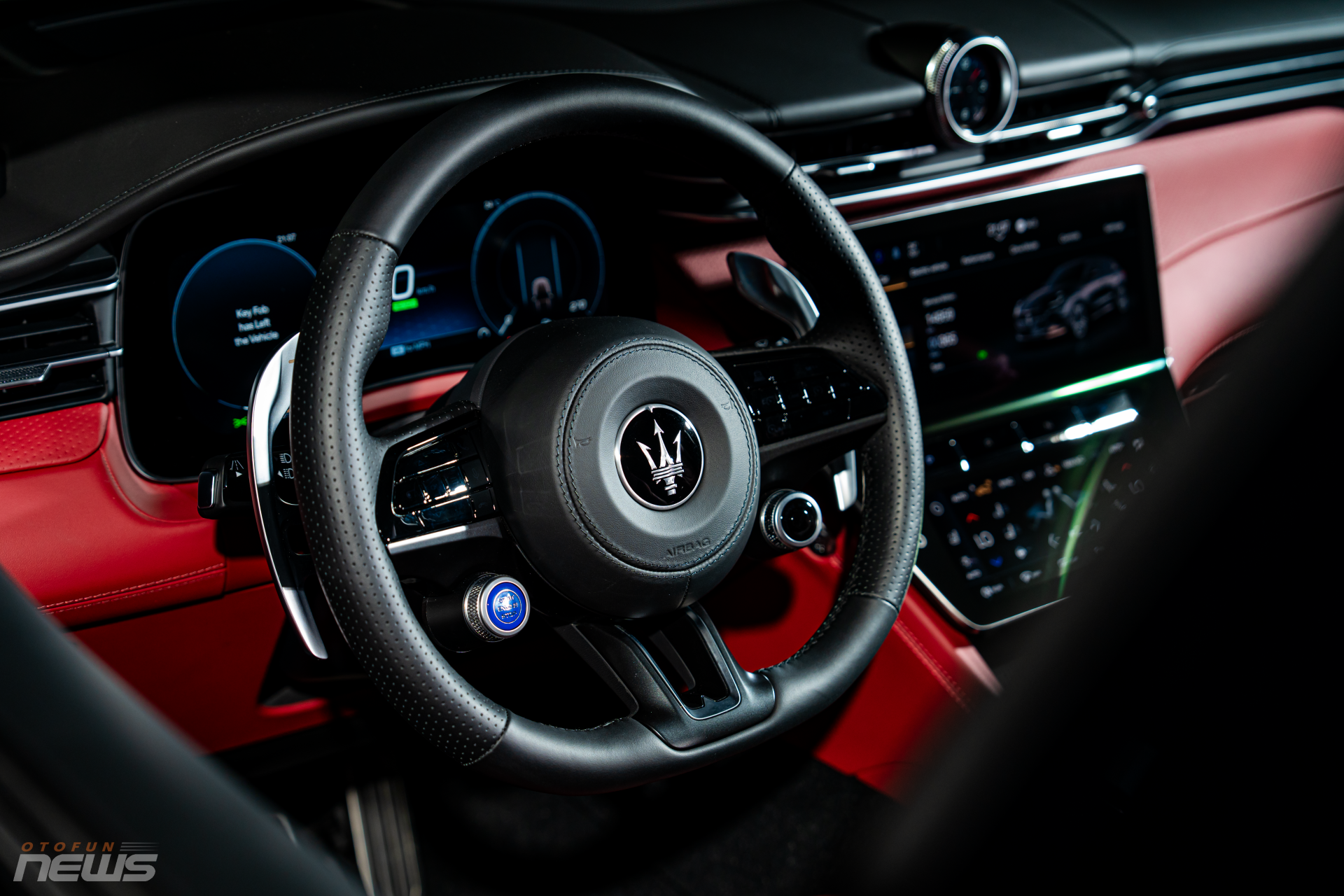 Khoang nội thất sử dụng vật liệu tái chế Econyl, mang lại không gian hiện đại và thân thiện môi trường. Xe được trang bị hệ thống ba màn hình kỹ thuật số (12,3 inch, 8,8 inch và bảng đồng hồ trung tâm 12,3 inch) cùng trợ lý ảo Maserati Intelligent Assistant (MIA).