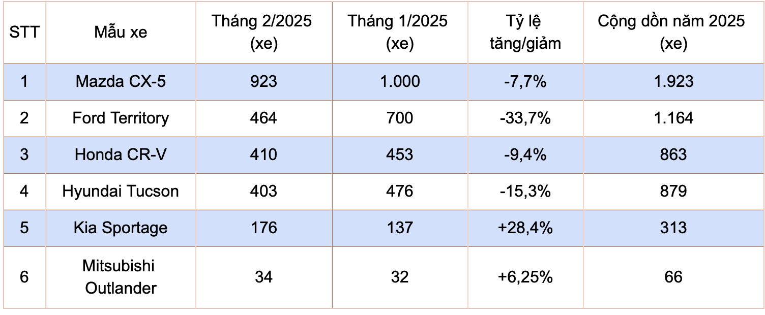 | Lượng bán CUV cỡ C tháng 2/2025. |
