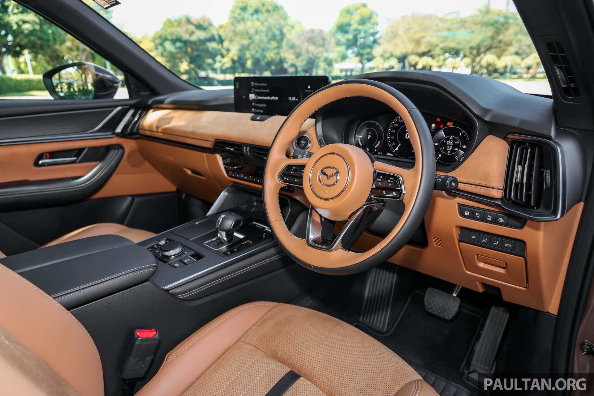 Khoang nội thất của CX-80 lấy cảm hứng từ CX-60, với màn hình trung tâm 12,3 inch, cụm đồng hồ kỹ thuật số 12,3 inch, kết nối Apple CarPlay không dây và Android Auto có dây.