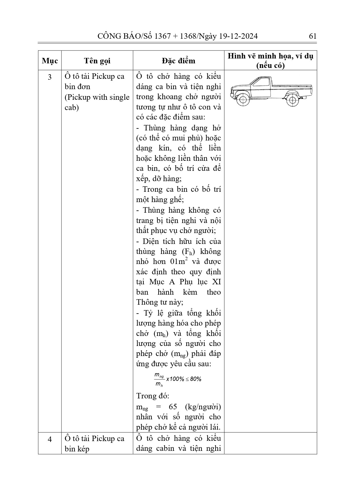 Ngoài ra tại Phụ lục I của Thông tư 53/2024/TT-BGTVT: Ô tô con (Pickup) là ô tô pickup có ít nhất một đặc điểm khác với ô tô tải pickup cabin đơn hoặc ô tô tải pickup cabin kép quy định Phụ lục IV ban hành kèm theo Thông tư này.