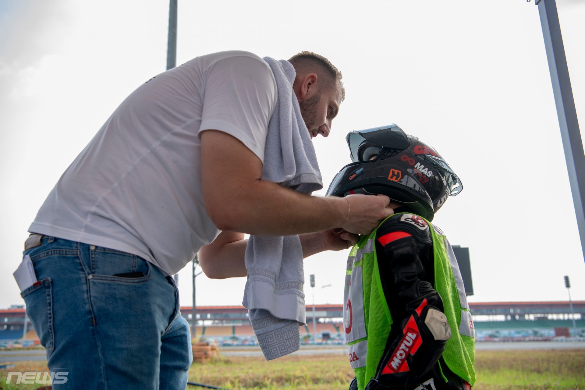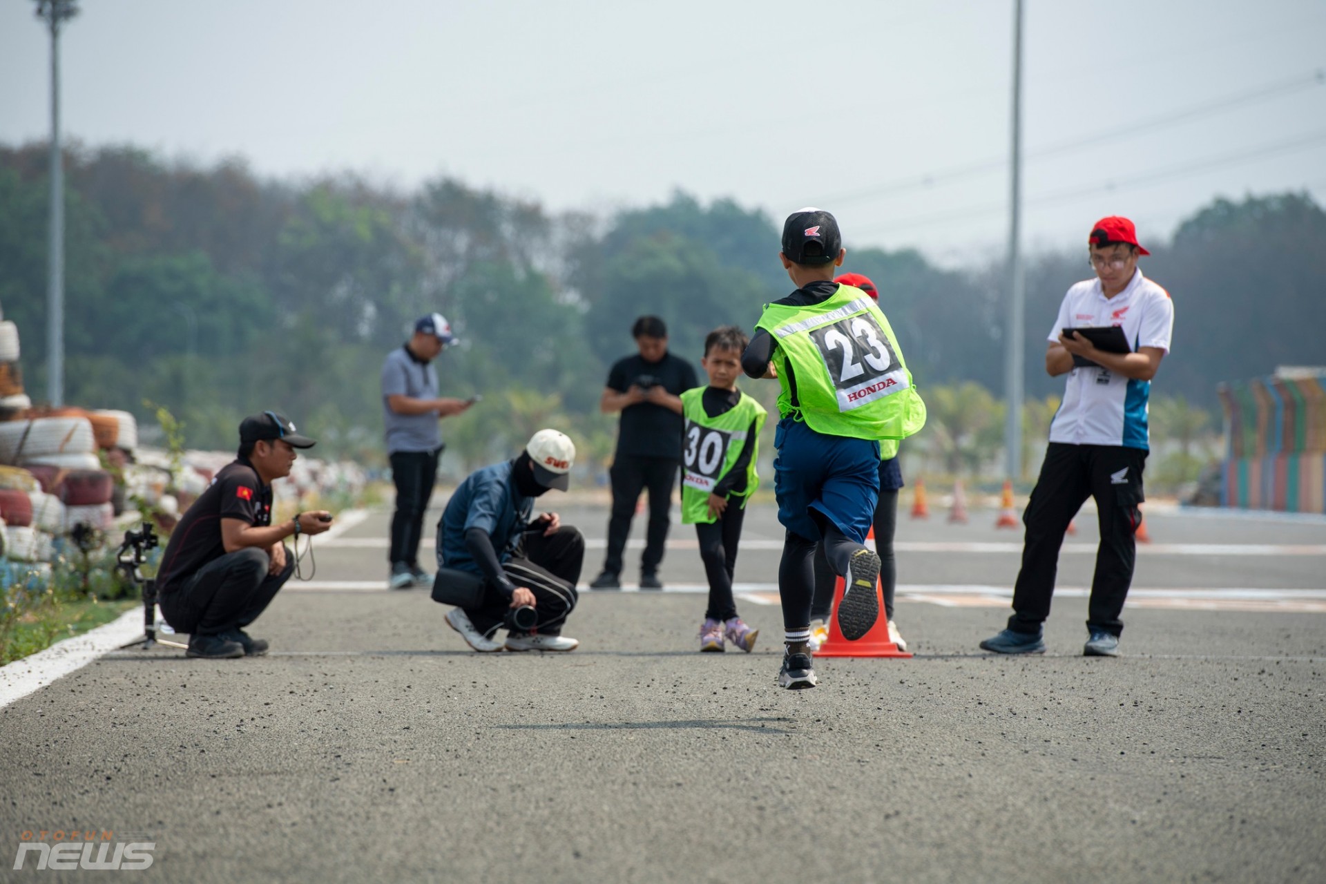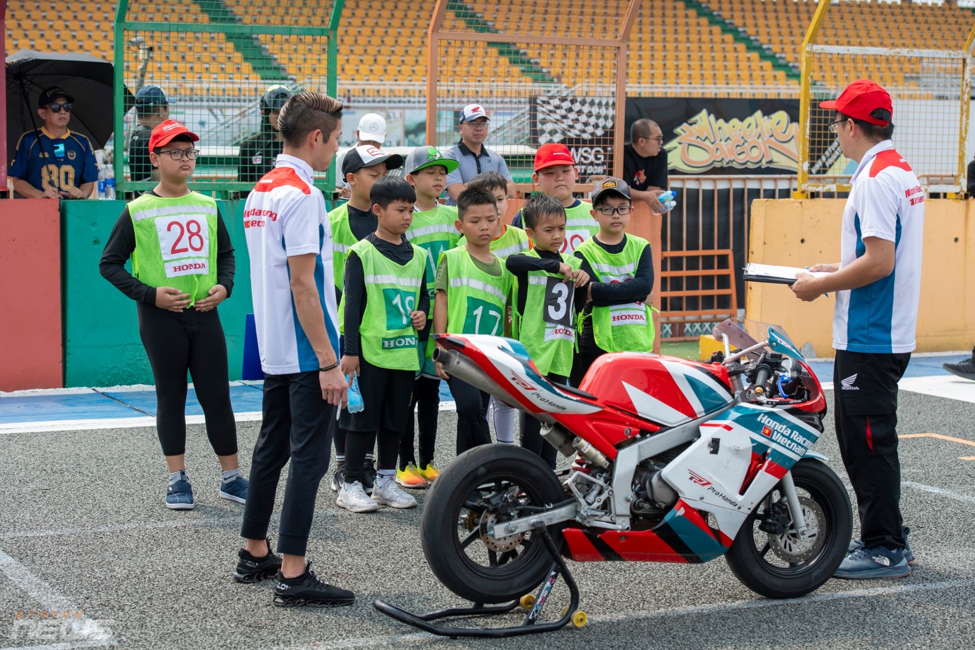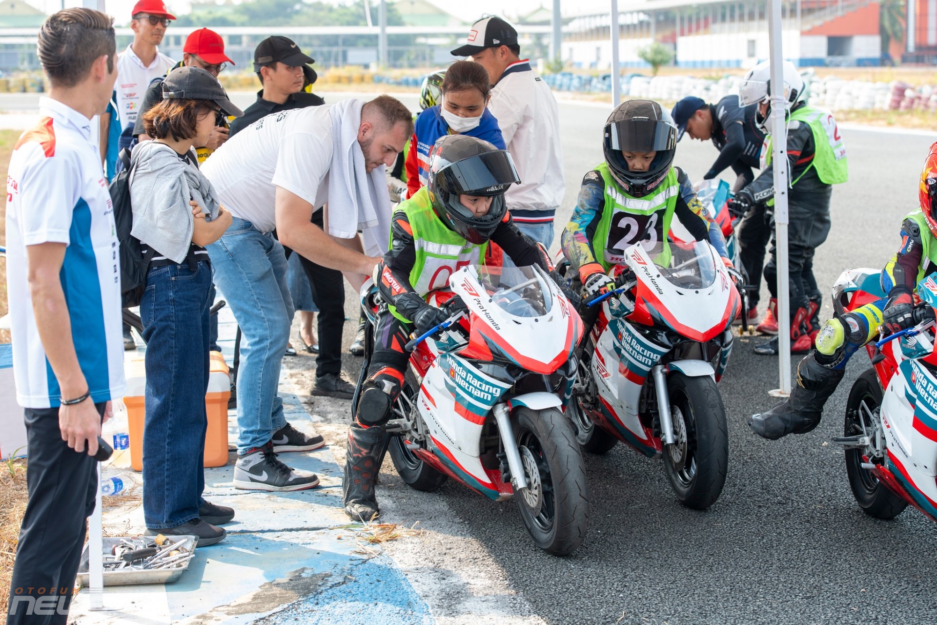 Dưới nắng, những gương mặt lấm tấm mồ hôi vẫn ánh lên sự tập trung cao độ. Có em nắm chặt tay lái, cúi thấp người theo từng góc cua. Có em ngã nhẹ rồi bật dậy thật nhanh, tiếp tục bài thi trong ánh mắt động viên của ban huấn luyện. Trên hàng rào kỹ thuật, các chuyên gia Honda Racing, trong đó có đội ngũ đến từ Nhật Bản và cả các kỹ thuật viên thuộc HRC, chăm chú ghi chép, trao đổi liên tục từng chi tiết nhỏ.