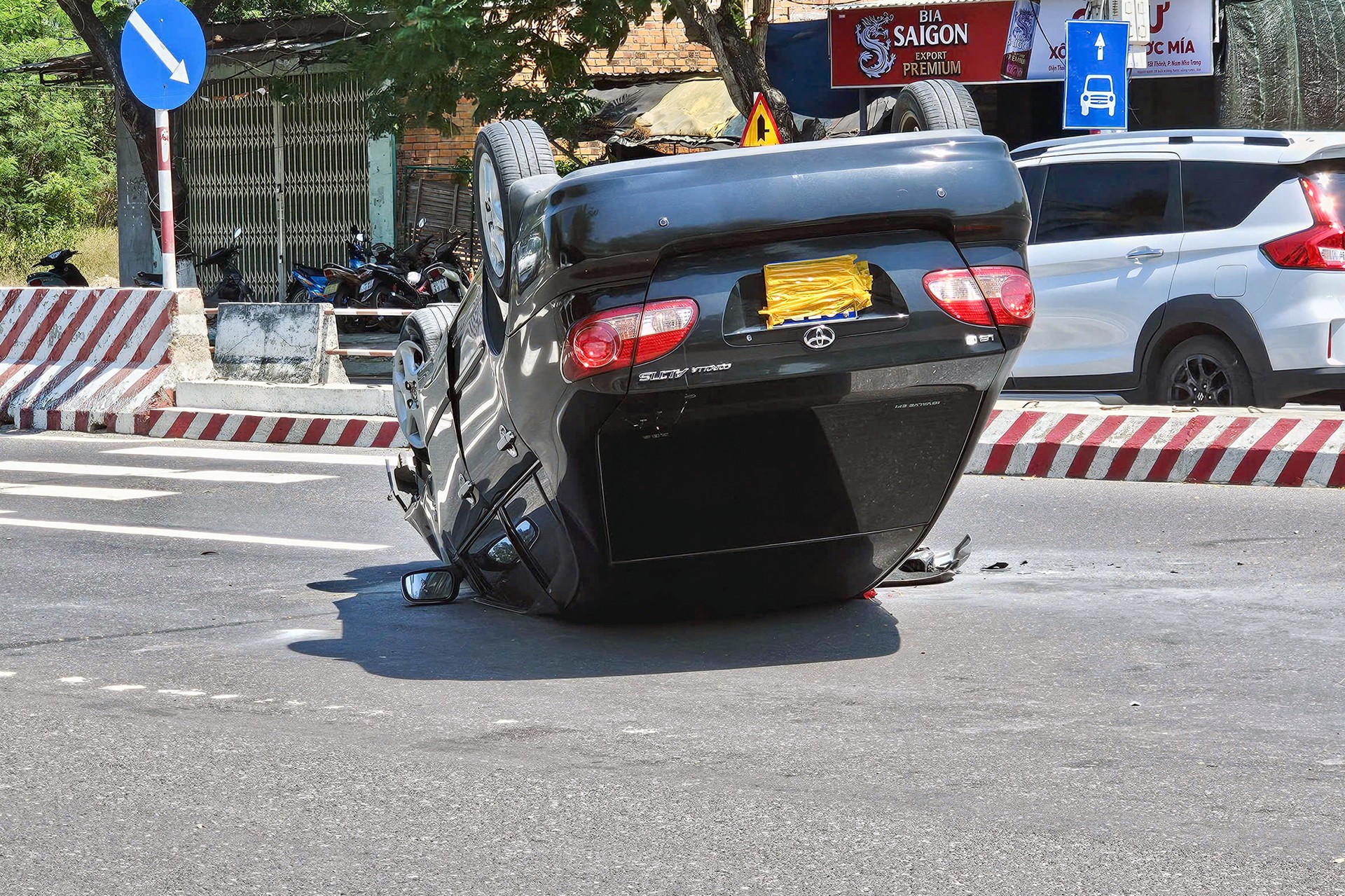 Ô tô tông dải phân cách rồi lật ngửa, người dân phá cửa cứu người