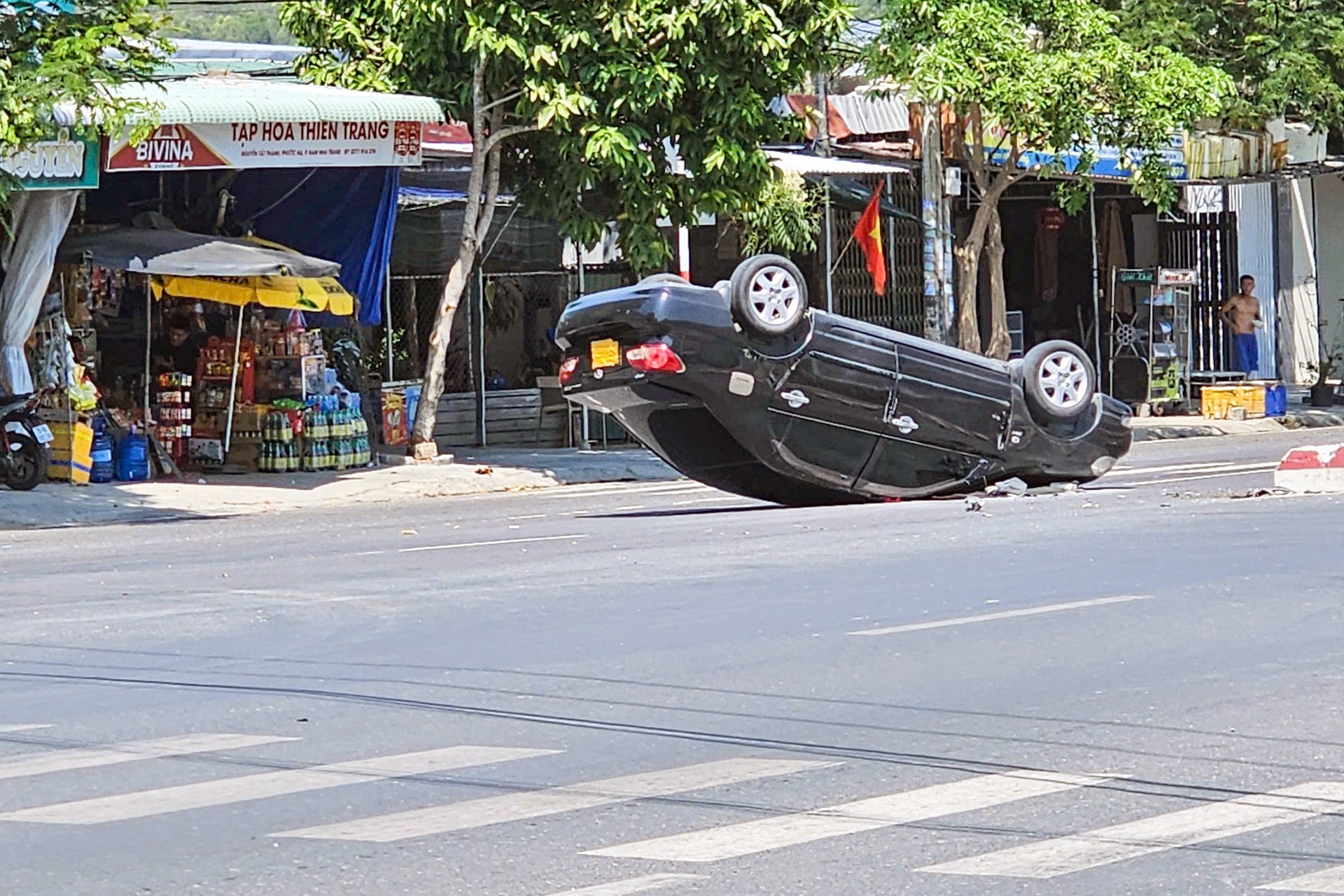 Khi đến khu vực gần resort Diamond Bay (phường Nam Nha Trang), ô tô bất ngờ lao vào dải phân cách rồi lật ngửa ở làn đường đối diện. Lúc này, khói bốc lên từ phần đầu xe.
