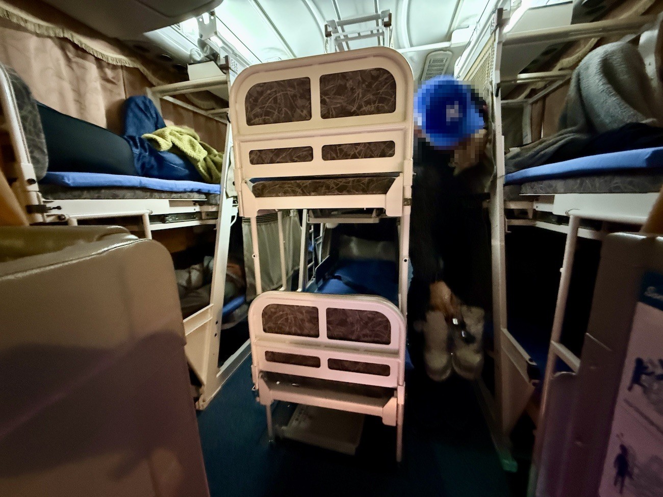 Điểm độc đáo của loại ghế này là khả năng “biến hình”, ban ngày có thể bố trí như ba dãy ghế độc lập, còn ban đêm lại "hô biến" thành giường nằm hai tầng, chẳng khác nào một “ký túc xá mini” di động.